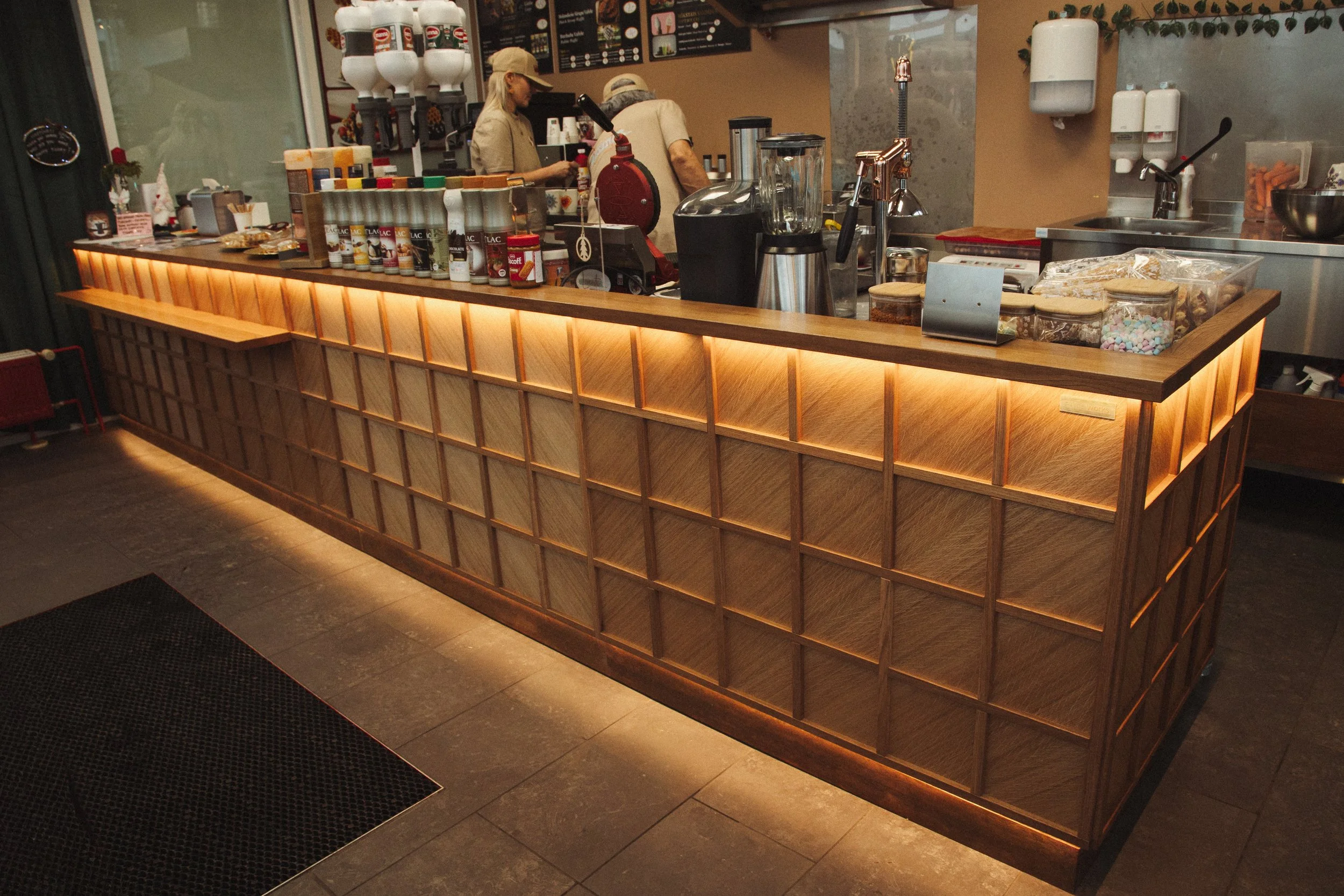 Their vision was to create a Belgian waffle café at Riga International Coach Terminal, where quality would guide every detail. For their interior, we developed a fully bespoke furniture solution focused on durability, sustainability, and structural strength.